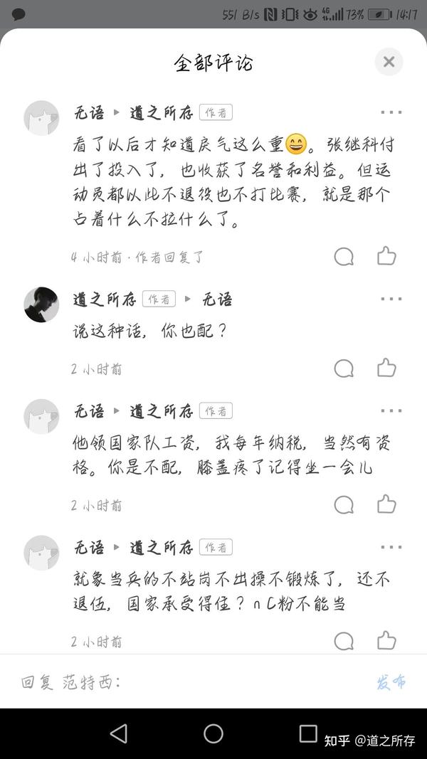 放一张评论 这种话居然也说的出来 张继科待在国家队既能做陪练 也能帮着宣传 没想到在这位知友眼中就变成了白拿工资不干活 这是有多酸哪 现在的键盘侠可真牛逼 还说我是脑残粉