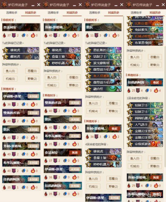 下面是我四个回合中的对战历史截图,你会发现盒子的战棋记牌器会记录对手在上次碰到你时的阵容,包括种族、身材、数量等等。